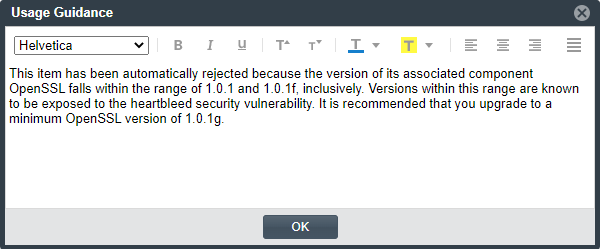 • This item has been automatically rejected due to the component being OpenSSL versions 1.0.1 through 1.0.1f. These are known to be exposed to the heartbleed security vulnerability. We recommend you upgrade to a minimum OpenSSL version of 1.0.1g.